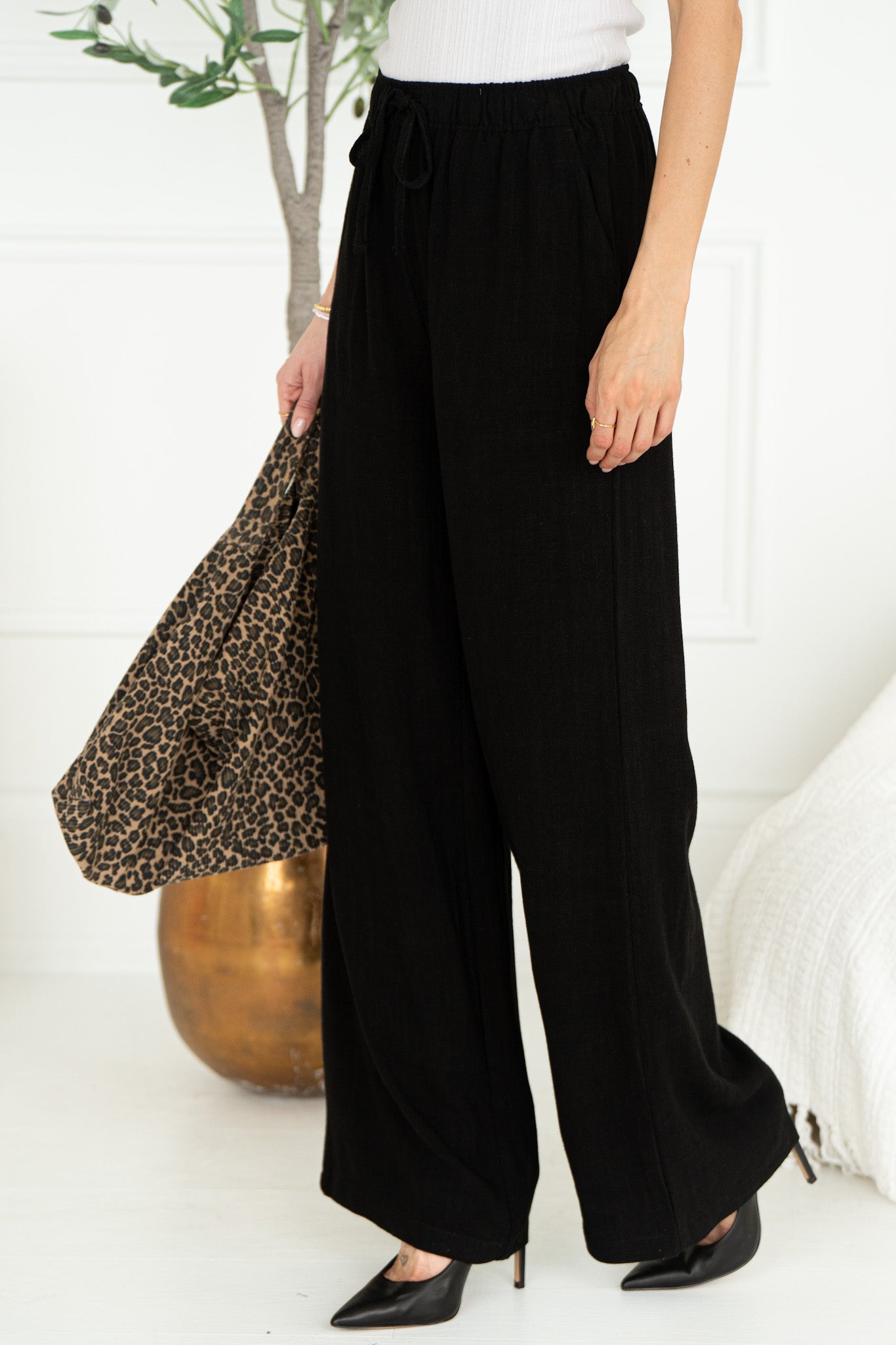 SEA BREEZE WIDE LEG LINEN PANTS-BK