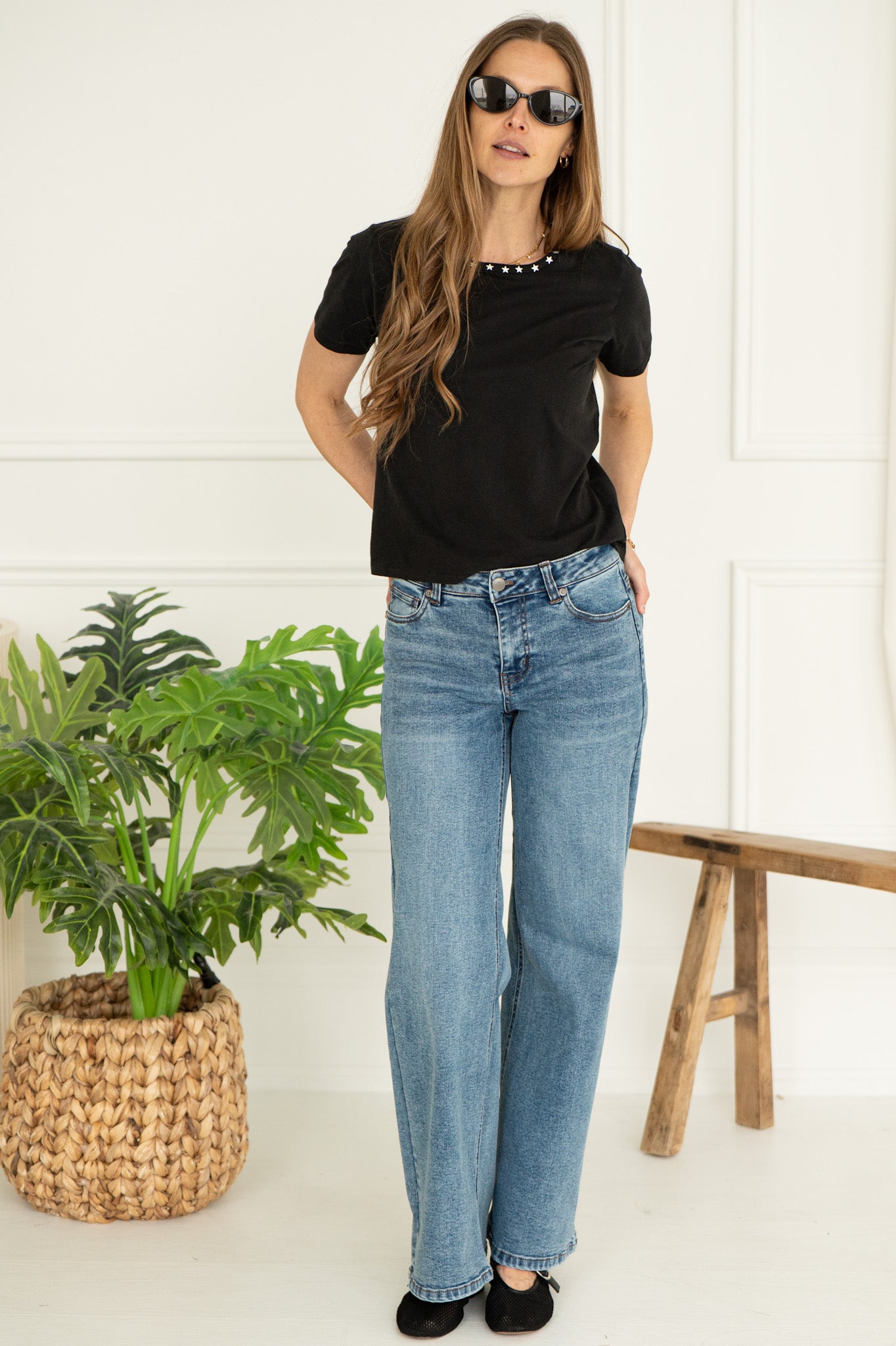 Styled With: Paloma Wide Leg Jeans -BL, Nouveau Sunglasses -PBG, Ember Gold Plated Earrings, Mylan Gold Plated Necklace, Joanna Gold Plated Necklace, Mylan Gold Plated Bracelet, Joanna Gold Plated Bracelet, Lyndon Gold Plated Ring, and Ember 2in1 Gold Plated Rings.