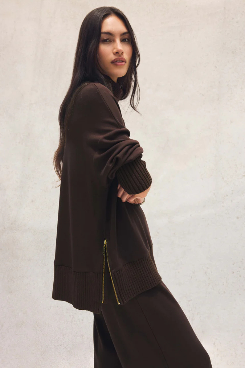 - Ribbed knit detailing on hemline, cuffs, and neckline